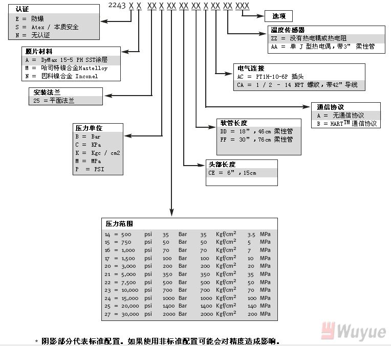 工作特性 ★ HARTTM數(shù)字通信 ★ 綜合誤差優(yōu)于 ± 0.25% ★ 4-20mA 回路供電輸出 ★ 0-500 至 0-30,000 psi ★ 防爆、本質(zhì)安全或 ATEX 認(rèn)證 * ★ 符合 PED 和 CE 要求  優(yōu)點(diǎn) ★ 可通過手持方式進(jìn)行配置 ★ 可重復(fù)性精密壓力測(cè)量 ★ 可將輸出直接傳送給 DCS 或 PLC ★ 用戶可以精確調(diào)整壓力范圍 ★ 危險(xiǎn)環(huán)境使用認(rèn)證 ★ 符合新的 EC 要求 產(chǎn)品描述    SPX2243 系列產(chǎn)品是一種設(shè)計(jì)用于危險(xiǎn)地帶的智能型 4-20mA 壓力變送器。 SPX2243E 型產(chǎn)品通過了 1 Class , Division I, Groups A 、 B 、 C 和 D 的防爆認(rèn)證。防爆型產(chǎn)品包括導(dǎo)線連接件。 SPX2243S 型產(chǎn)品通過了 ATEX II 1 G 100a 認(rèn)證以及 Eex ia IIC 0 和 1 區(qū)域的本質(zhì)安全認(rèn)證。這種本質(zhì)安全與 ATEX 型的產(chǎn)品既可以提供連接導(dǎo)線連接也可以提供 6 針連接接頭。 SPX2243 均采用全焊接結(jié)構(gòu),具有一個(gè)小膜片和一個(gè)安裝法蘭以便于安裝。此外,為適合測(cè)量熔體溫度,這個(gè)系列的產(chǎn)品可選購(gòu)安裝有熱電耦或熱電阻 SPX224高溫熔體壓力變送器(high temperature melt pressure transducer)